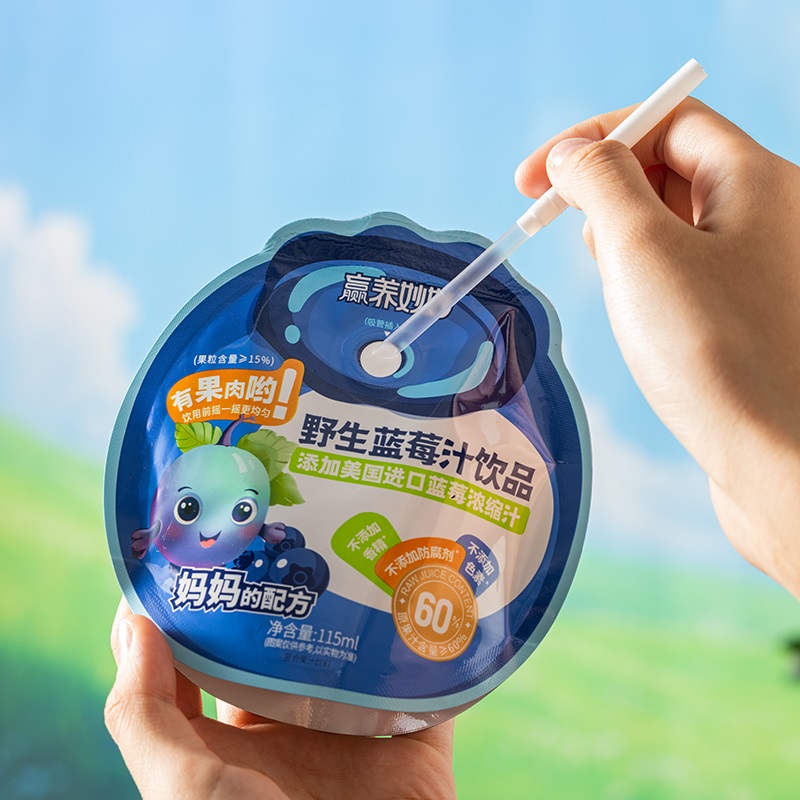 Inspired by a mother’s care, this bright and playful juice pouch is made for children who love both taste and texture. We combine real blueberry and apple pulp at 10% concentration, creating a naturally rich mouthfeel in every sip.